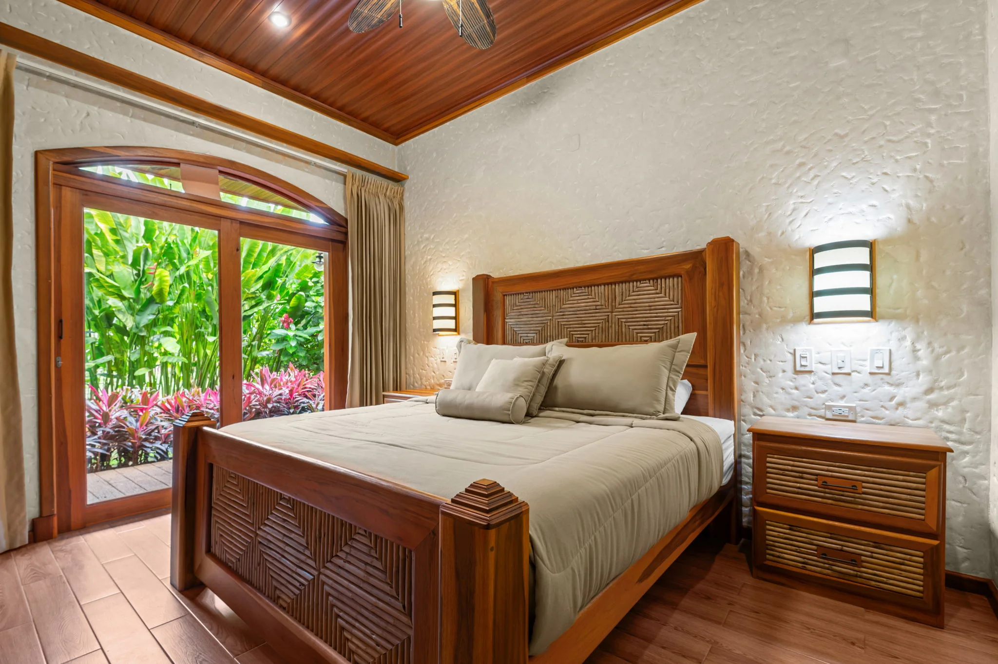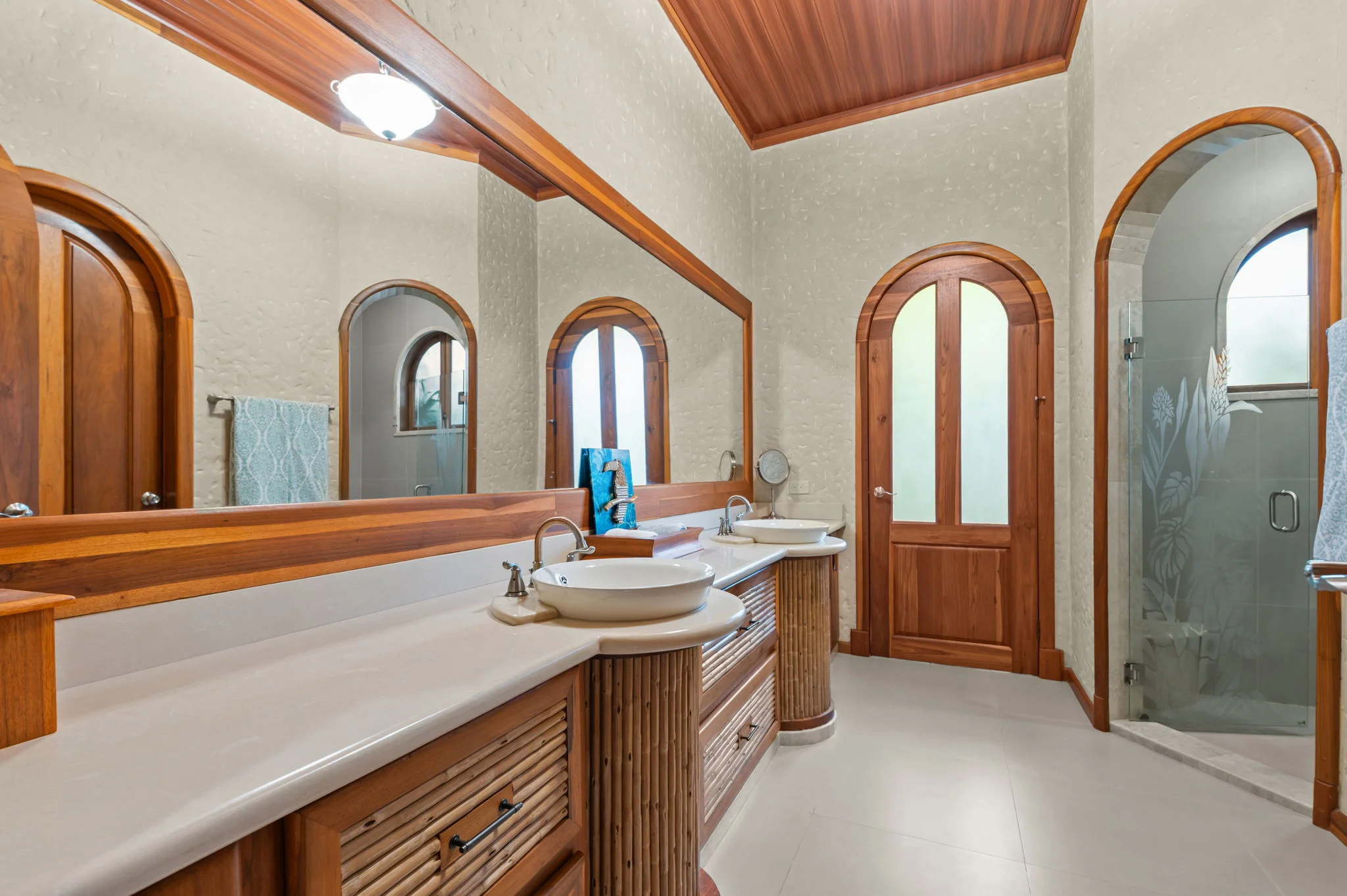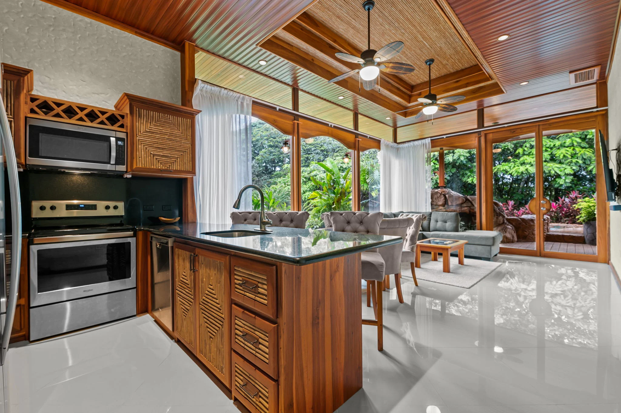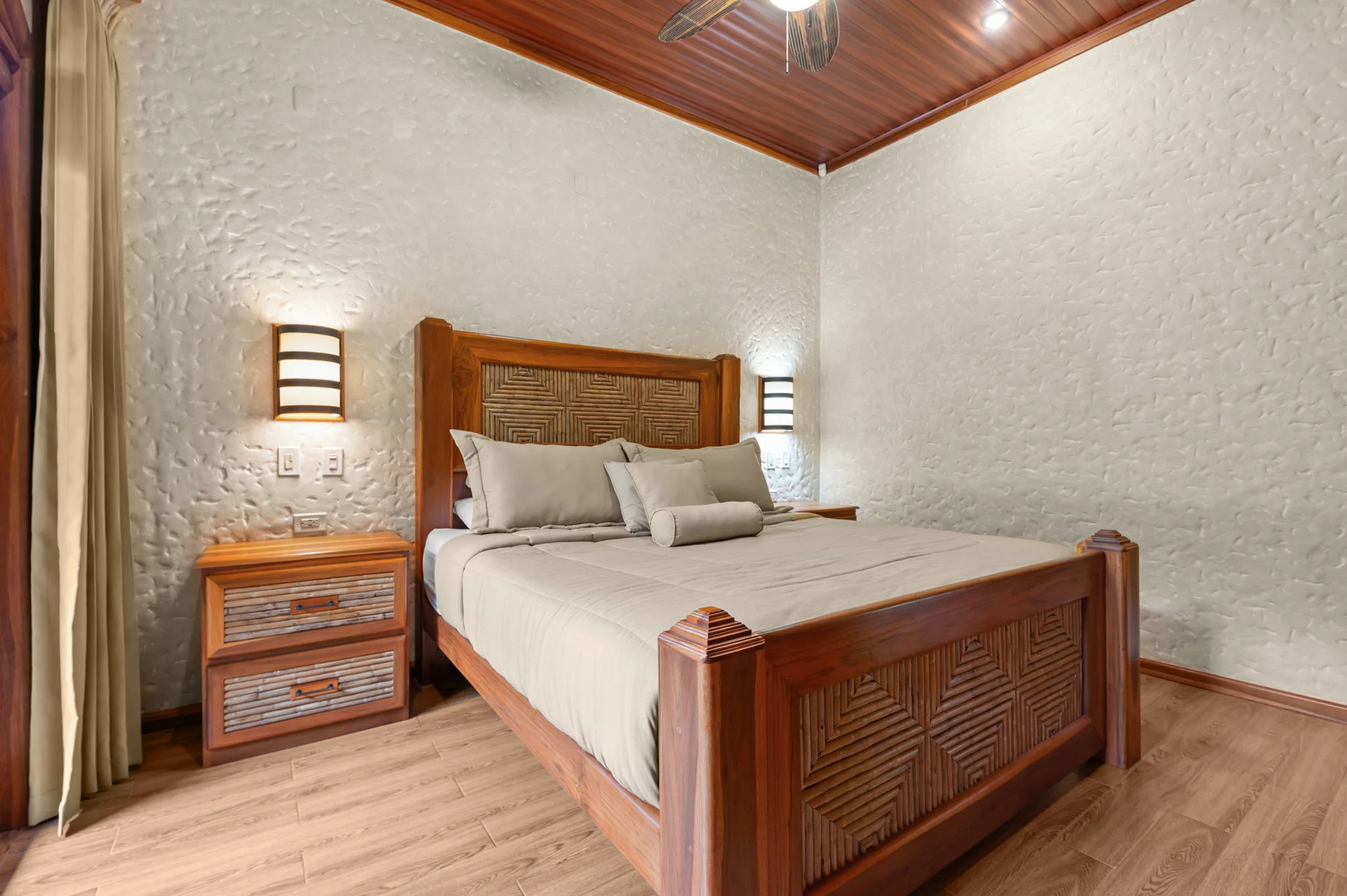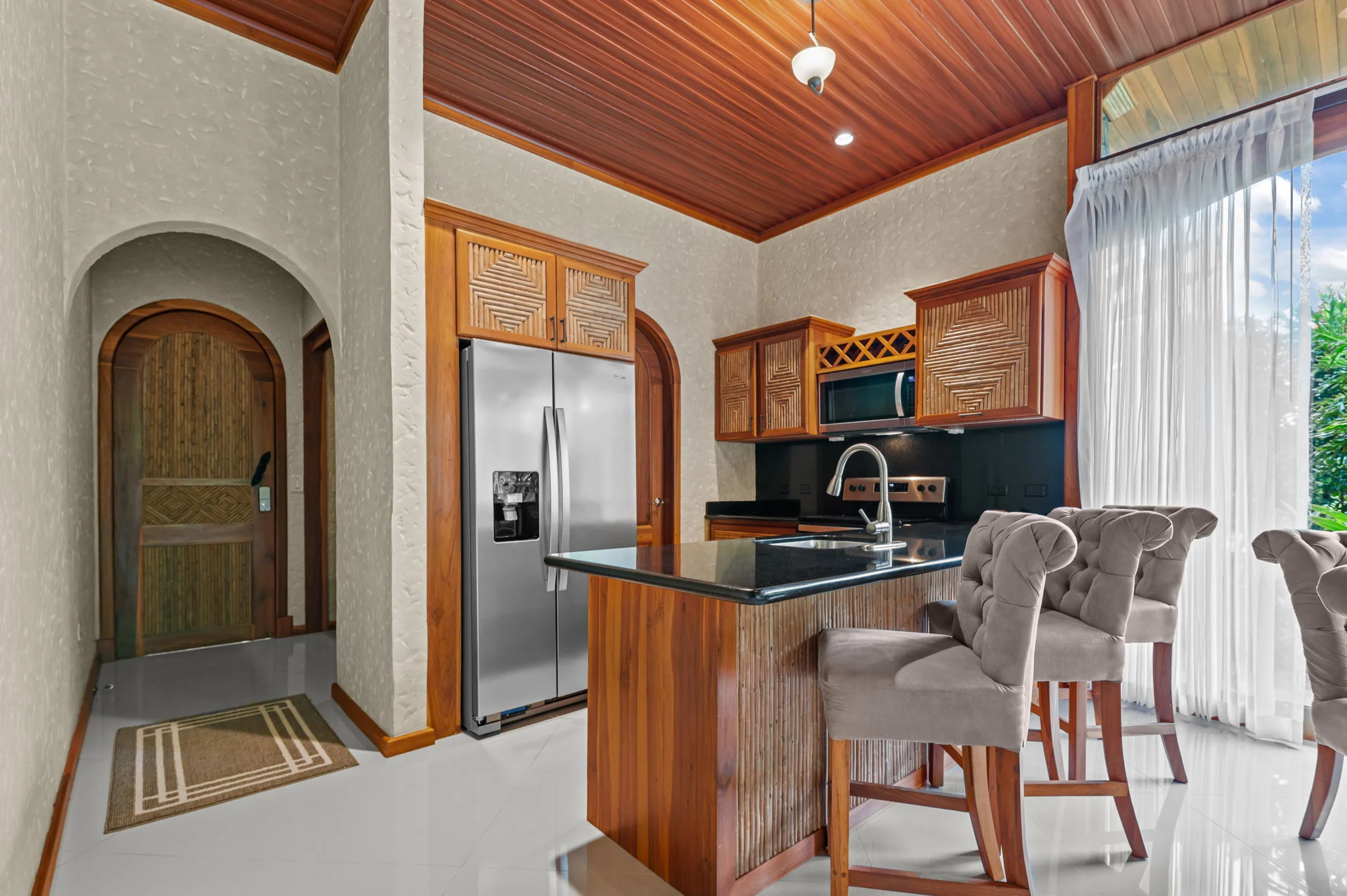 Natural materials define the character of Villa Torres. Solid wood ceiling detailing, natural stone countertops, and laurel cabinetry establish a warm architectural tone grounded in Costa Rica’s landscape.