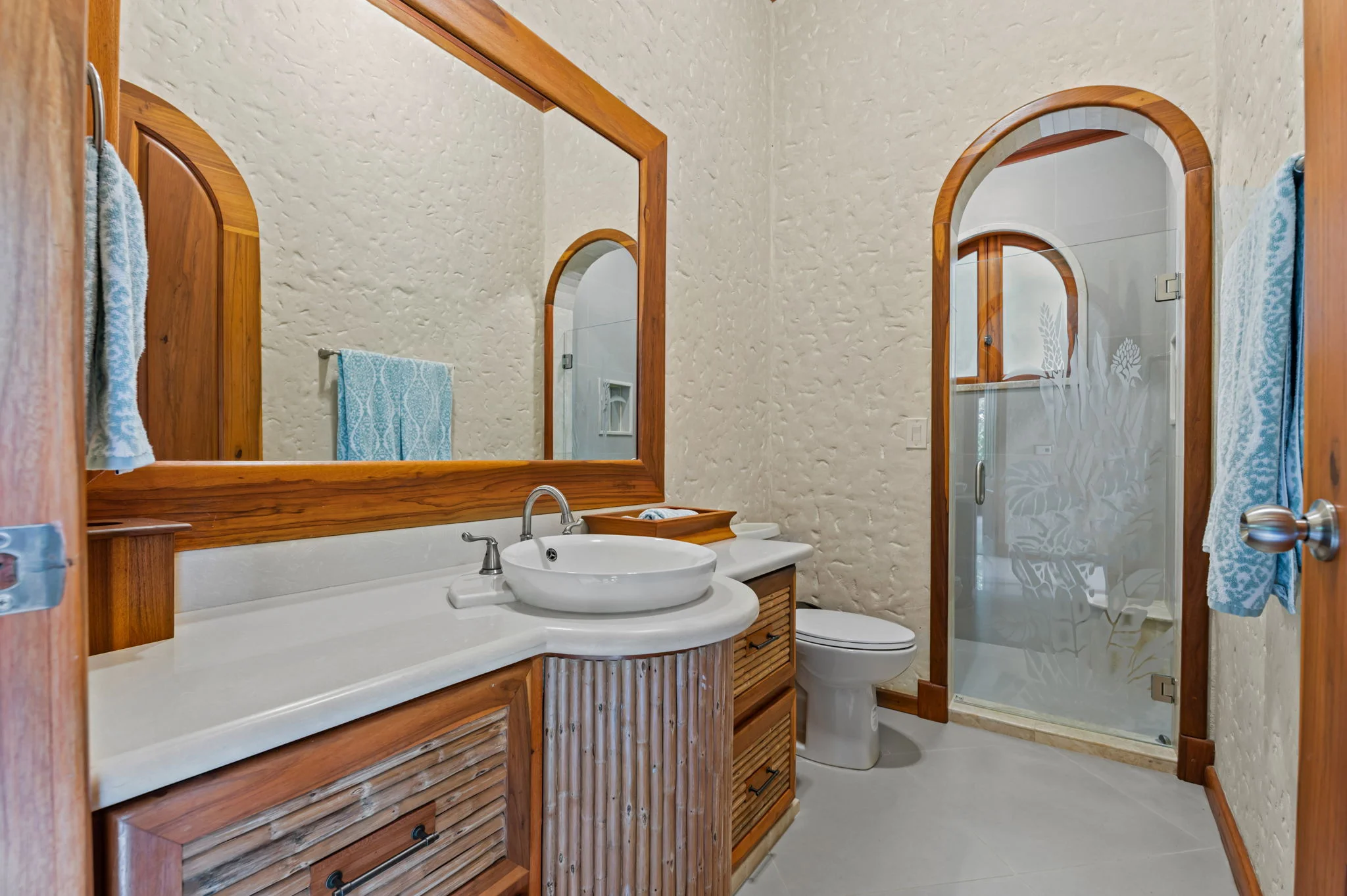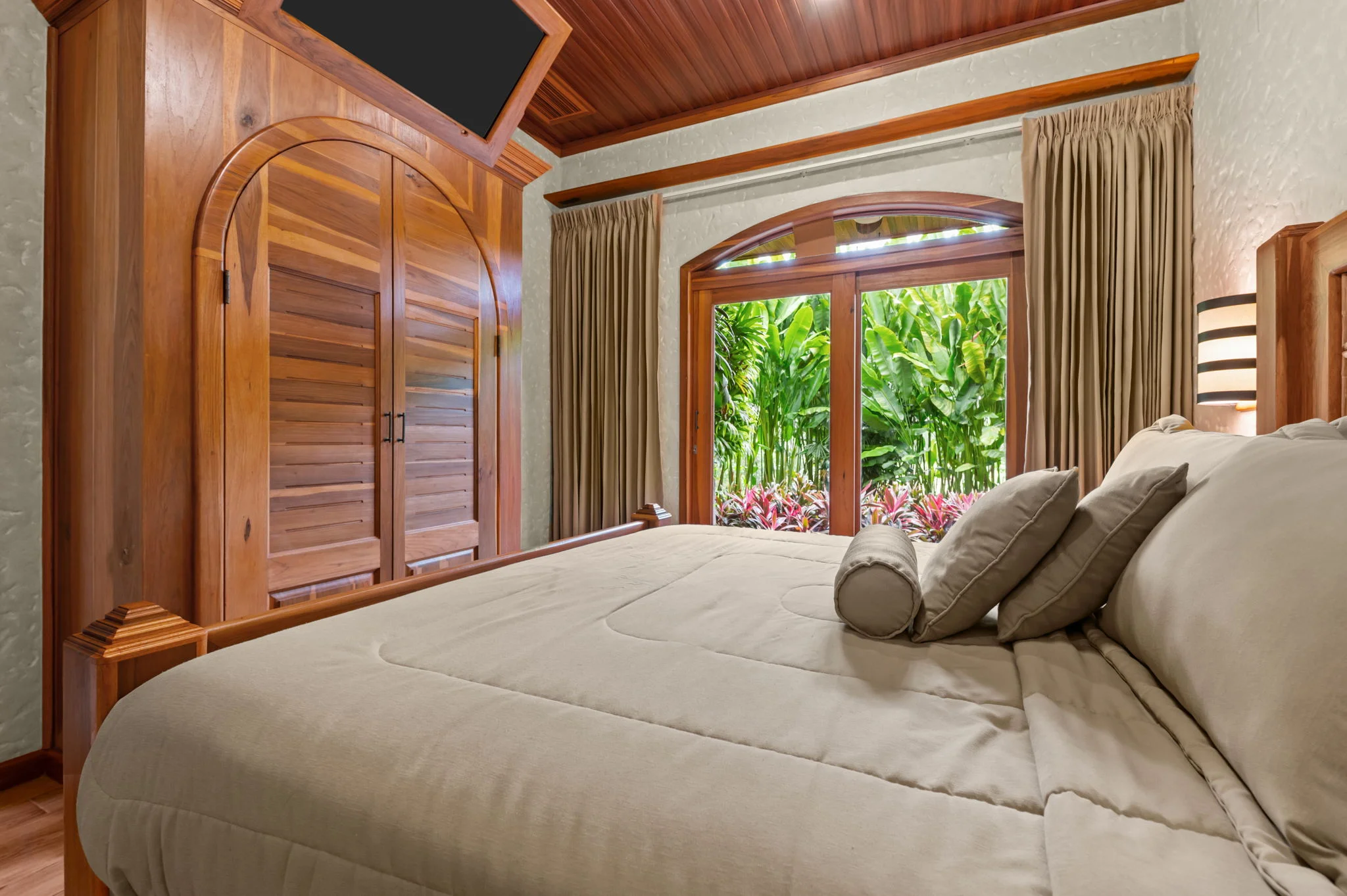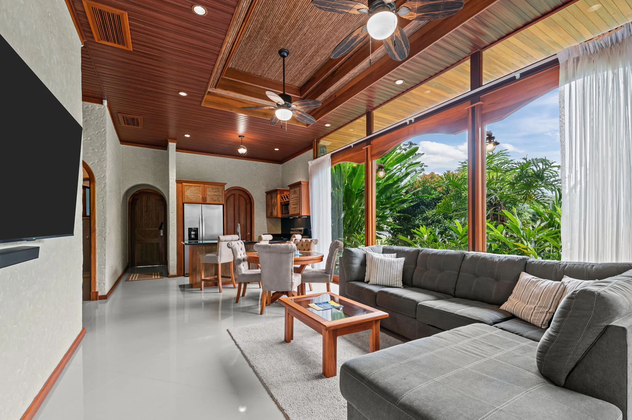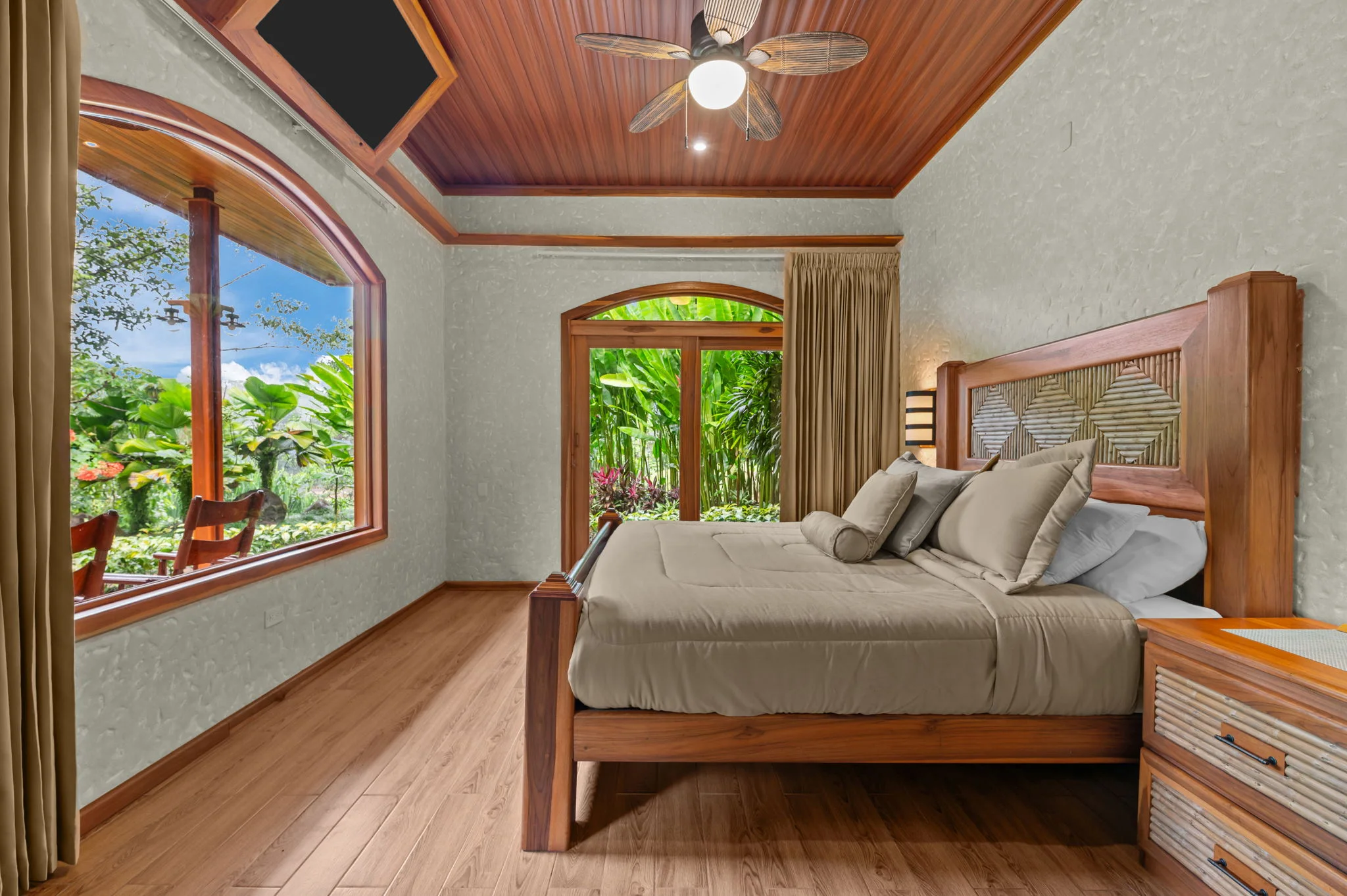 Natural materials define the character of Villa Torres. Solid wood ceiling detailing, natural stone countertops, and laurel cabinetry establish a warm architectural tone grounded in Costa Rica’s landscape.