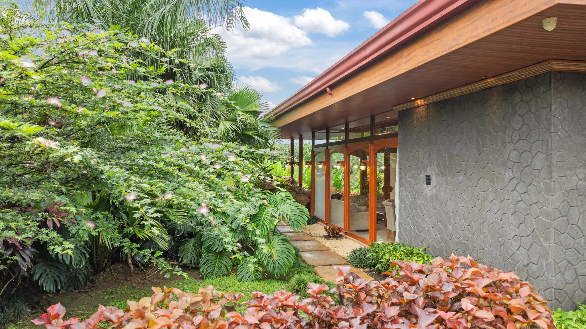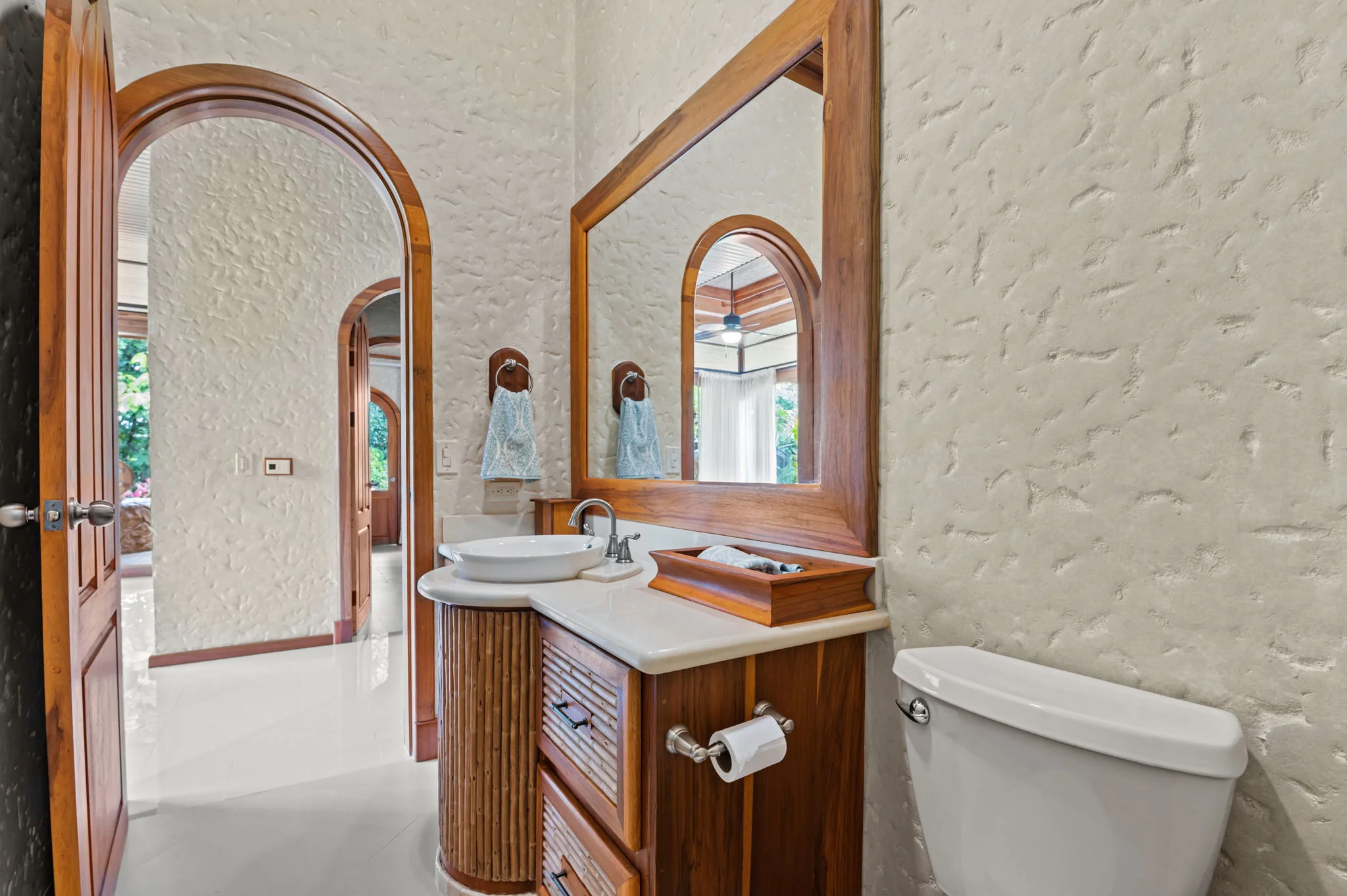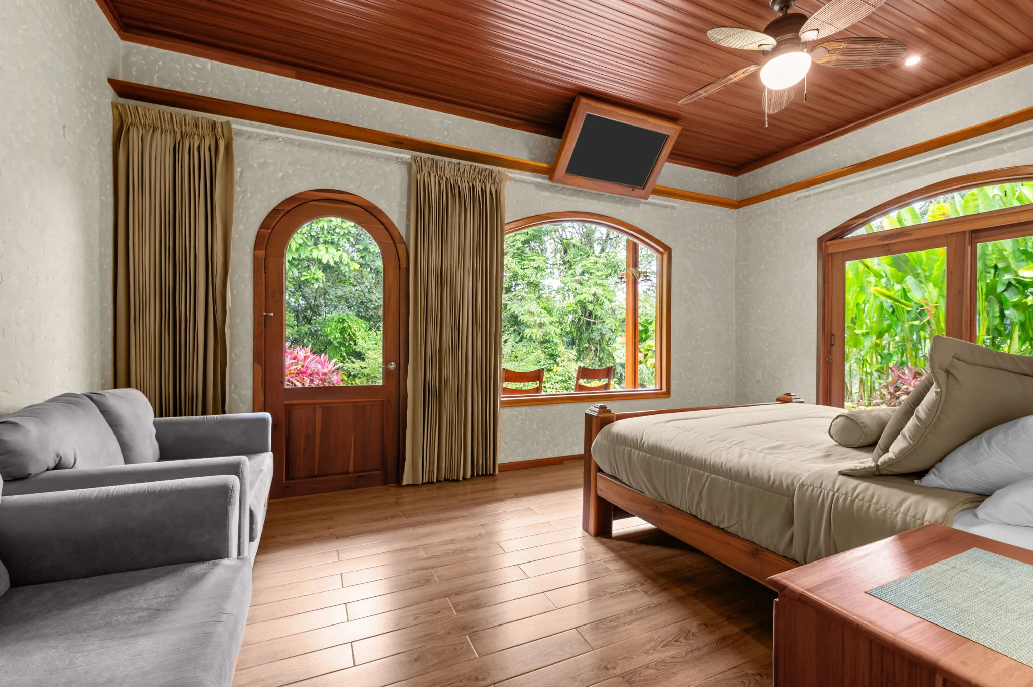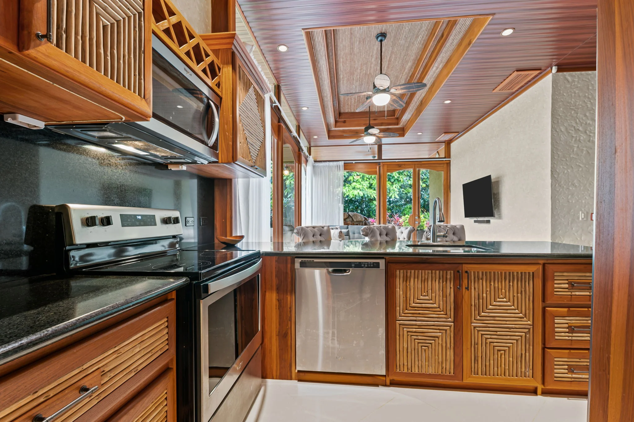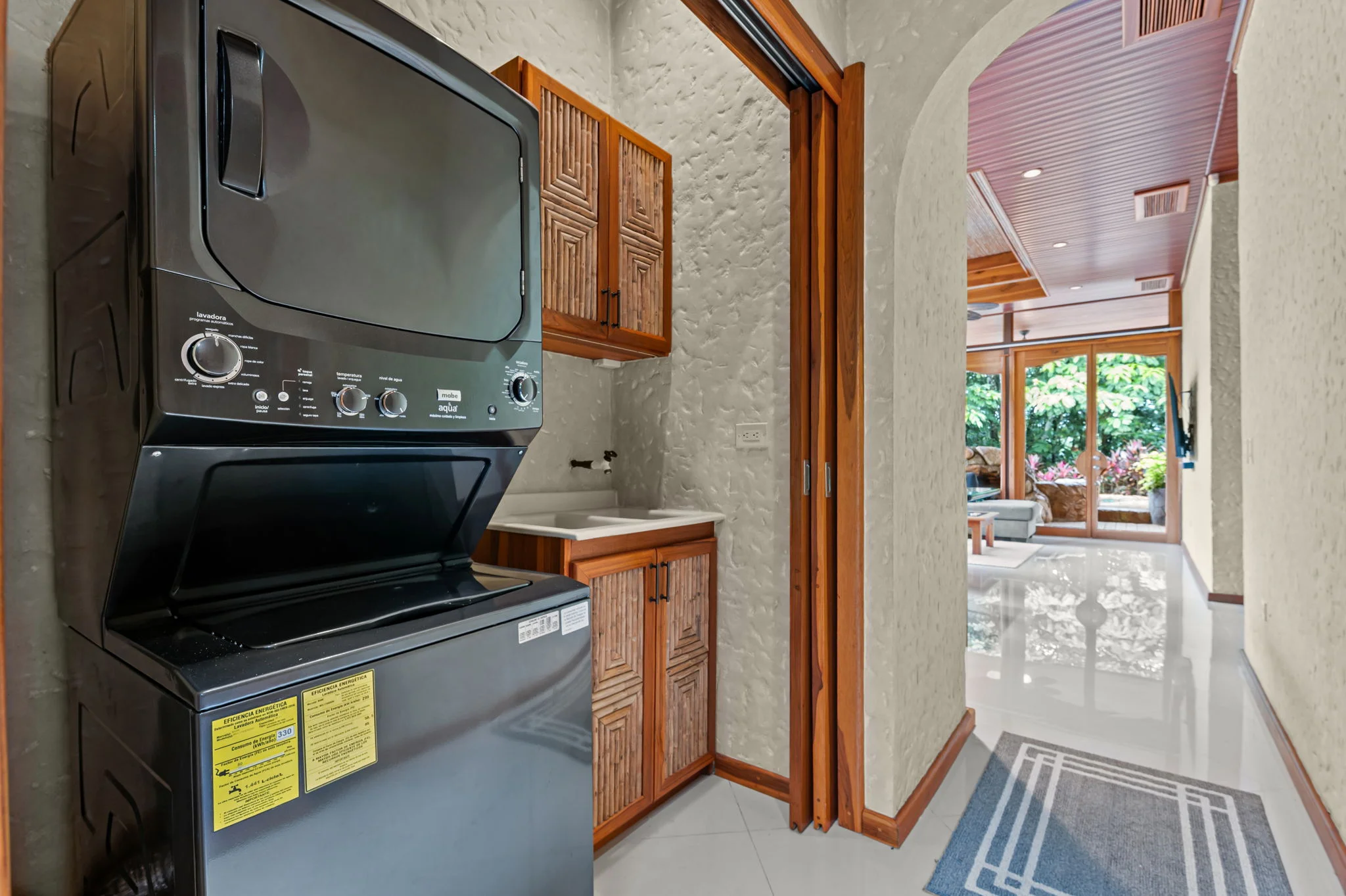 Natural materials define the character of Villa Torres. Solid wood ceiling detailing, natural stone countertops, and laurel cabinetry establish a warm architectural tone grounded in Costa Rica’s landscape.