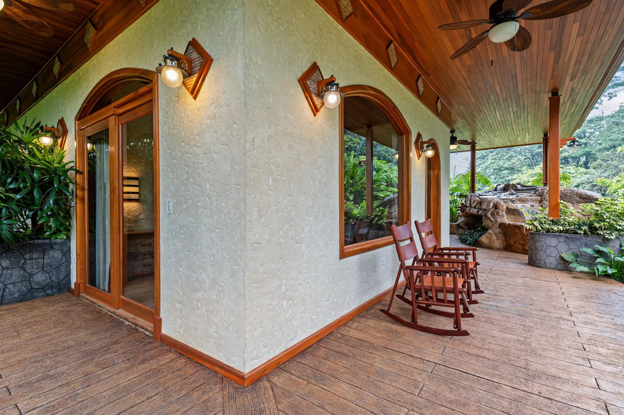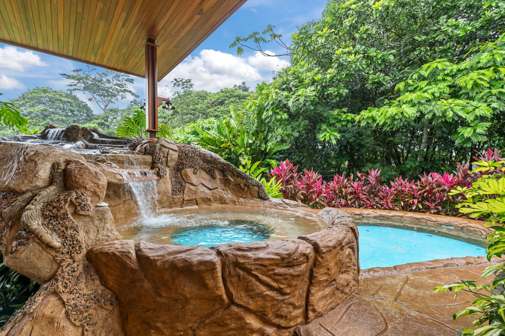 The private waterfall feature and covered seating areas create a defined outdoor environment that functions as an extension of the home rather than a separate space.