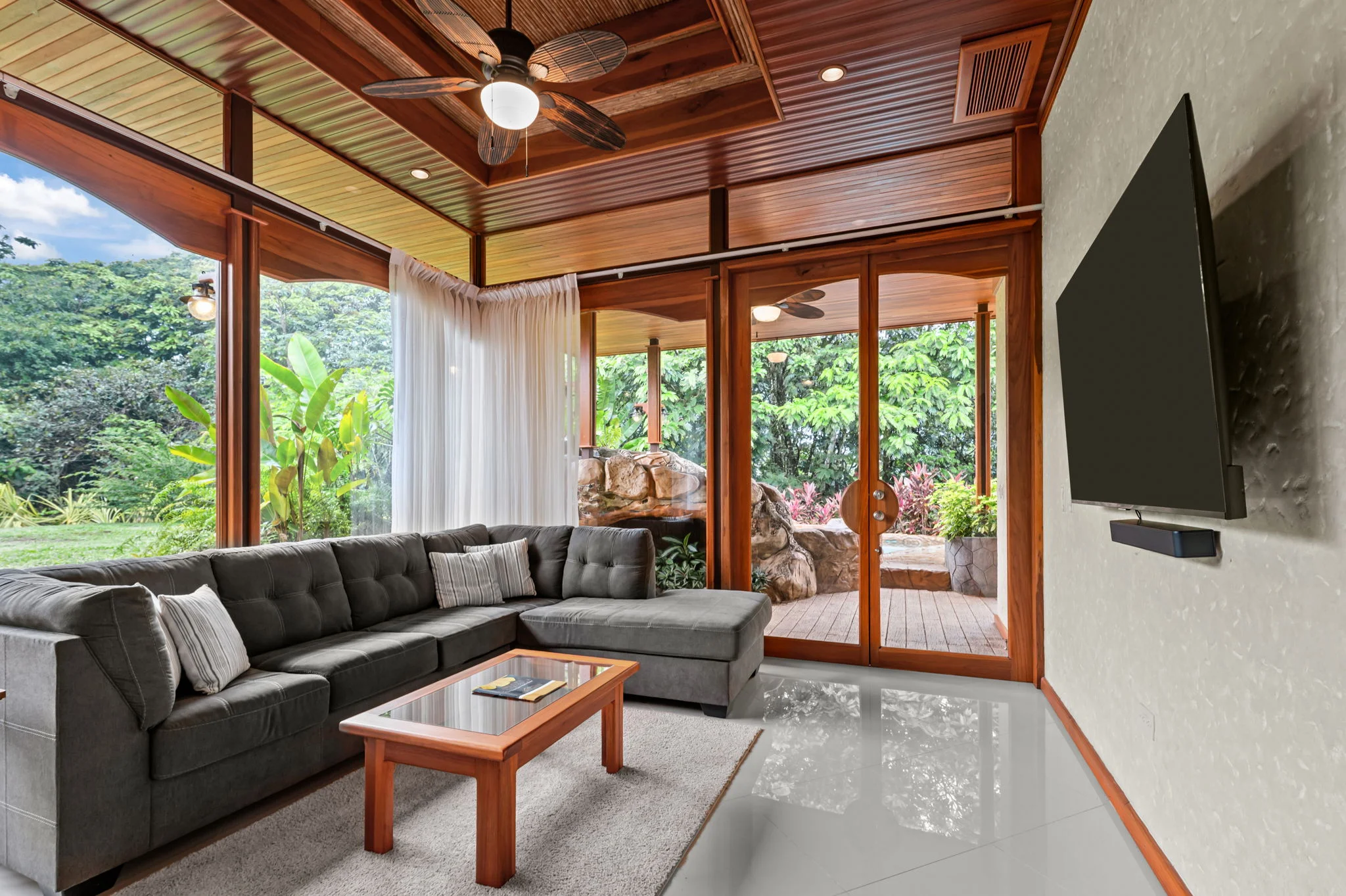 Teak flooring and integrated lighting enhance the open-plan living areas, while large sliding doors open directly to the covered terrace and private waterfall feature — creating a continuous indoor–outdoor environment designed for both daily living and seasonal residence.